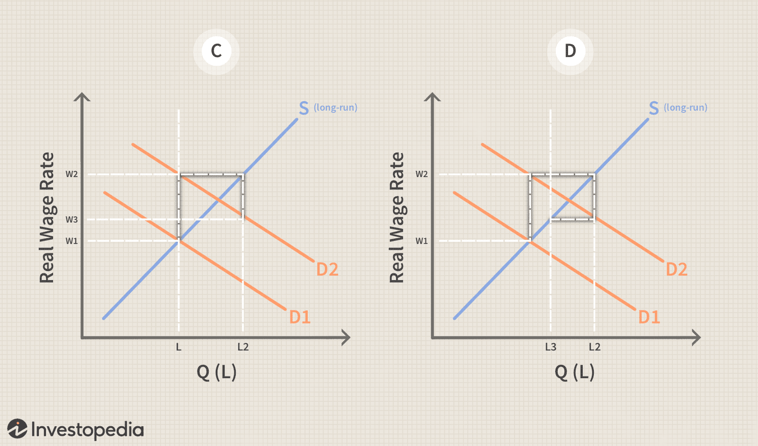 In the short run, the increase in demand for better-trained workers results in an increase in wages above the equilibrium level (graph A). We can see the shift in increased demand (D2) and where it intersects W2 representing the increased wages. However, L, which represents the short-term labor curve, also intersects W2 and D2.