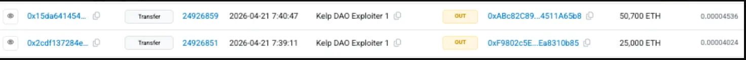 PeckShield: KelpDAO attacker has transferred 75,700 ETH to 2 new addresses