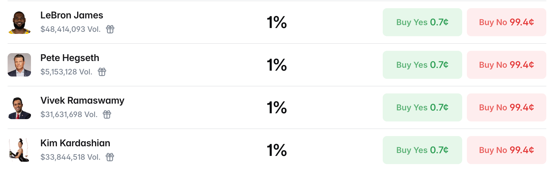 For example, the highest trading volume is surprisingly NBA star LeBron James (LeBron James, $48.41 million), followed by entertainment socialite Kim Kardashian (Kim Kardashian, $33.84 million), and even some candidates who do not have U.S. citizenship (not eligible to run), such as billionaire Elon Musk (Elon Musk, $23.14 million), New York City Mayor Zohran Mamdani (Mamdani, $18.39 million)…