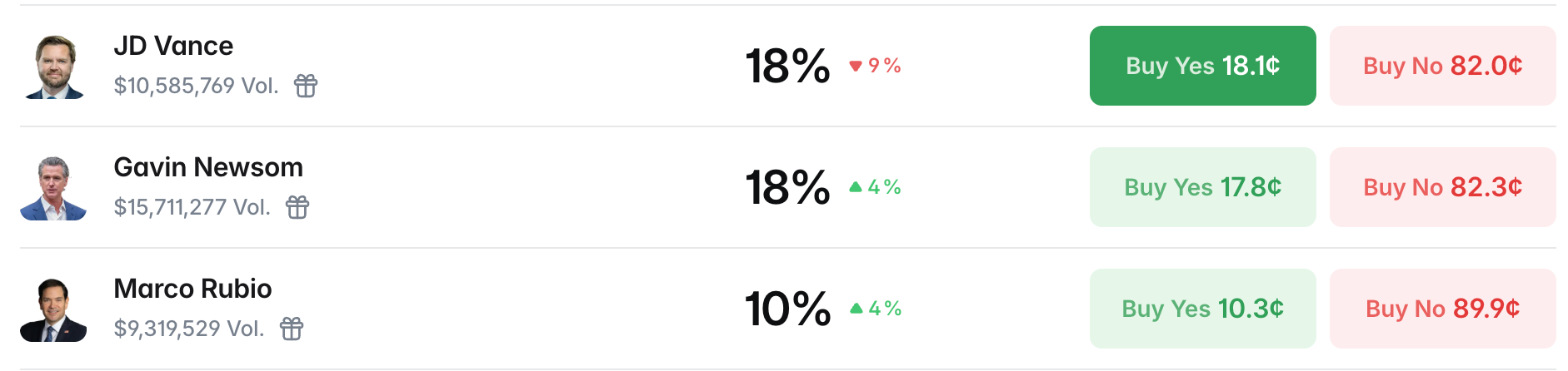 As for those real high-probability candidates, such as the current leading vice president JD Vance (trading volume $10.58 million), California Governor Gavin Newsom (trading volume $15.71 million), Secretary of State Marco Rubio (trading volume $9.32 million), their trading volumes are far below those “internet celebrity candidates.”