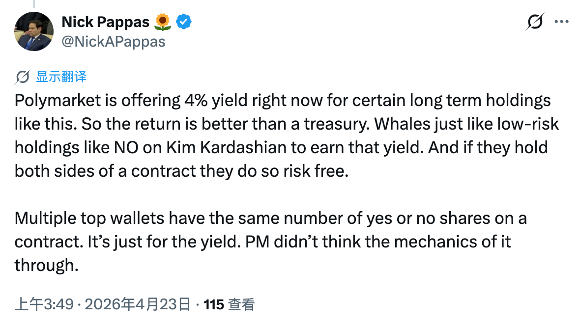 Nick Devor stated that a 4% annualized return exceeds the real-time U.S. Treasury yield (5-year at 3.98%), so whales prefer this low-risk position, such as buying NO shares of LeBron James or Kardashian (either way, whoever is more popular, buy their NO), to earn this part of the return; holding both YES and NO shares simultaneously can achieve risk-free profit.