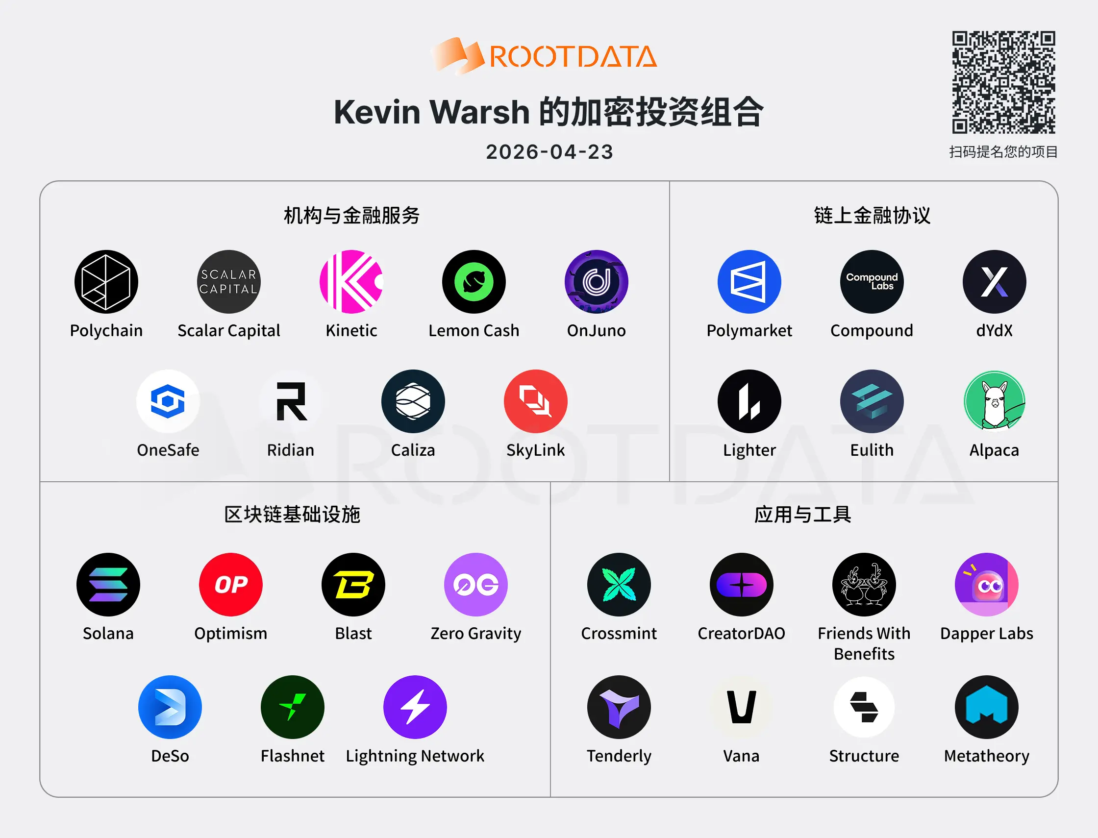 ChainCatcher News: The Web3 asset data platform RootData has mapped the crypto investment portfolio of the Federal Reserve nominee Kevin Warsh, covering multiple areas including blockchain infrastructure, on-chain financial protocols, institutional financial services, and application tools. From a structural perspective, Warsh’s allocation can be divided into four major segments: