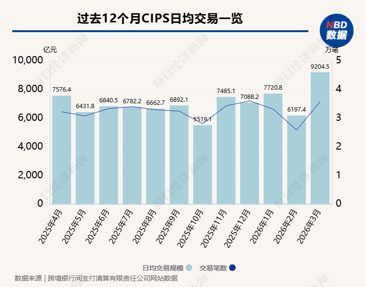 Data from the Cross-Border Interbank Payment System (CIPS) shows that the system’s transaction volume in March hit a 12-month high, with an average daily transaction volume of 920.5 billion yuan, and 35.74k transaction cases, a significant increase from 8B yuan and 25.93k cases in February.