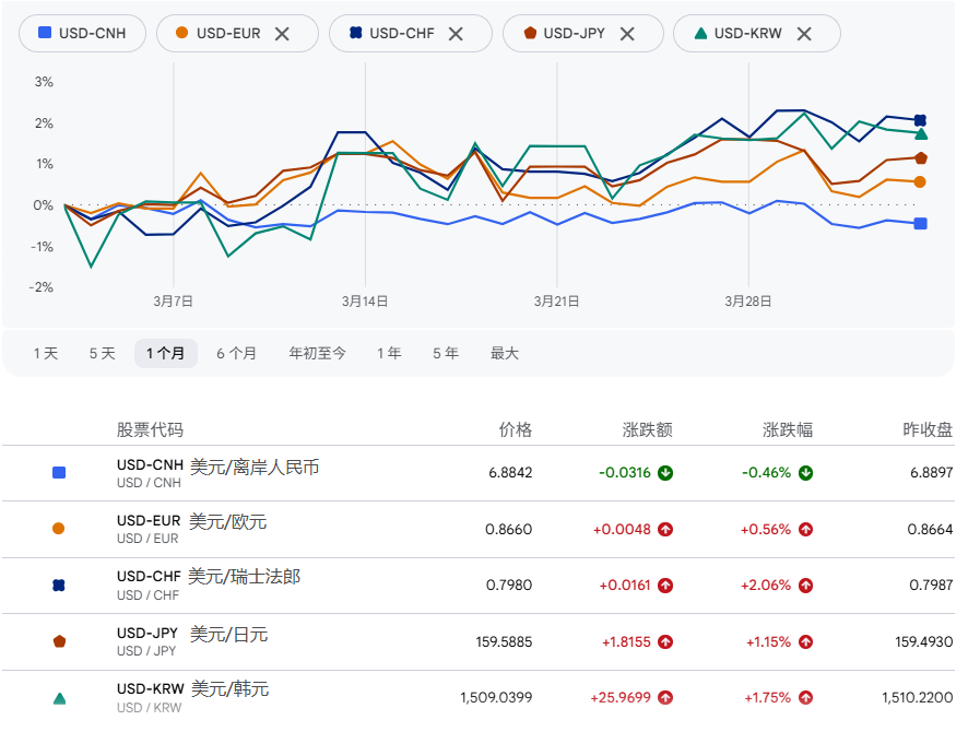 In the month ending April 3, the U.S. dollar index experienced a phased strengthening, with currencies of developed economies such as the euro, Canadian dollar, Swiss franc, Japanese yen, and Korean won generally under pressure. The Korean won against the dollar even briefly fell below 1,530. The Japanese yen was very weak, falling below 160 on March 27. Even the traditional “safe-haven currency,” the Swiss franc, did not show obvious strength, depreciating 2.06% against the dollar.