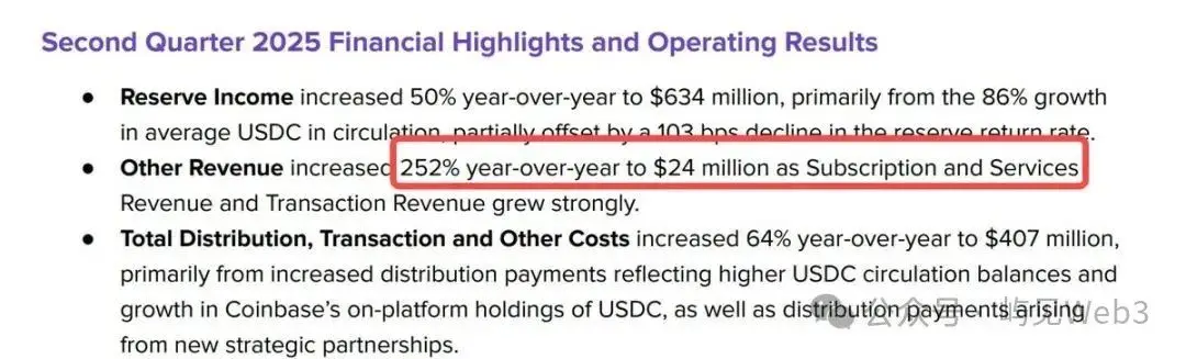 The data shows that in this year’s second quarter, Circle’s subscription and service revenue reached $24 million—about 3.6% of total revenue (with the majority still coming from interest on USDC reserves)—but it grew 252% year over year.