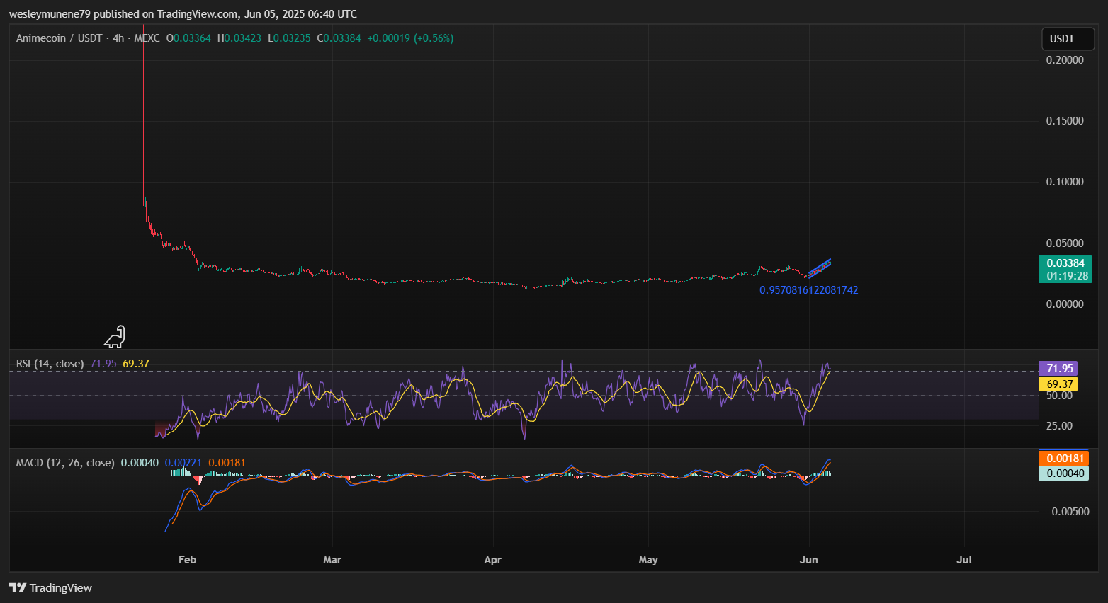 Após uma consolidação prolongada, Animecoin começou a atrair touros na sua tendência de preço. Um gráfico de 4H do TradingView indica que o indicador MACD mostra momentum altista, com a linha MACD em 0.00221 acima da linha de sinal em 0.00181. Este cruzamento sugere um aumento da pressão de compra à medida que o histograma se torna positivo.