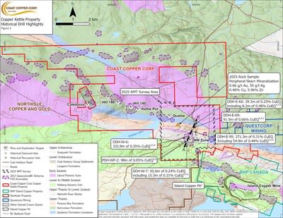 No norte da Ilha de Vancouver, um corredor de 50 quilômetros (“km”) de extensão leste-oeste abriga uma série de sistemas de porfírio de cobre-ouro (“Au”)-molibdênio do Jurássico Inferior mineralizados. Na extremidade oeste, a Coast Copper possui a propriedade Knob Hill NW, que faz fronteira com as propriedades Hushamu e Red Dog da Northisle Copper and Gold Inc.1. Na extremidade leste, a Coast Copper possui a propriedade Copper Kettle, adjacente ao Contrato de Mina de Cobre da Ilha da BHP. A propriedade Copper Kettle abriga a NW Zone², um dos seis sistemas de porfírio calc-alkalino do Jurássico geneticamente relacionados que formam o ICC. O ICC ocupa uma anomalia estrutural-magnética de 10 km de comprimento com a NW Zone, que é o único membro localizado fora do Contrato de Mina de Cobre da Ilha da BHP. A Mina de Cobre da Ilha é o único grupo de membros explorados até hoje (1971 - 1995), produzindo aproximadamente 345 milhões de toneladas com teores médios de 0,41% de Cu, 0,017% de Mo, 0,19 g/t de Au e 1,4 g/t de prata (“Ag”), além de rênio significativo³, tornando-se a segunda maior mina de cobre do Canadá na época de sua produção.