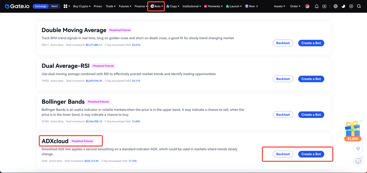 O ADXcloud é um indicador quantitativo que aplica um segundo suavização a um indicador padrão, ADX. Pode ser utilizado em mercados onde as tendências mudam lentamente. A Gate oferece bots de estratégia que permitem aos utilizadores criar e implementar estratégias rapidamente.