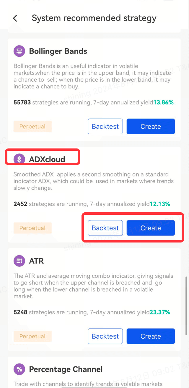 Negociação - Bots - Clique no primeiro ícone no canto superior direito - Criar uma nova estratégia - Estratégia recomendada pelo sistema - ADXCloud - backtest - Definir os Parâmetros - Createeters - Criar