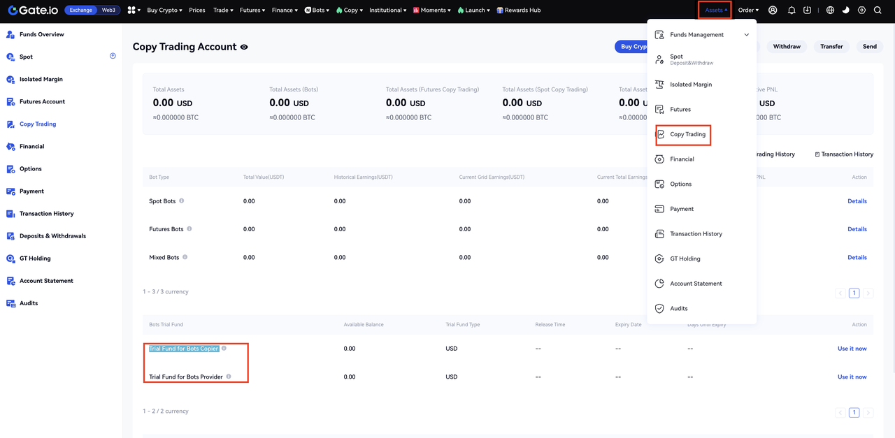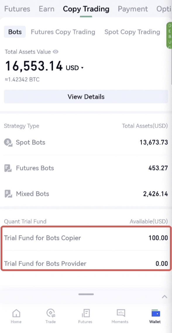 A: 3) Пользователи могут просмотреть пробный фонд для своих ботов в разделе “Активы” - “копитрейдинг”.;