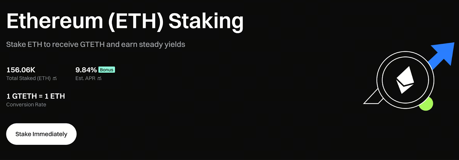 При внесении ETH система автоматически выпускает эквивалентное количество GTETH. Пока вы держите GTETH, стоимость токена отражает как доход от стейкинга, так и платформенные поощрения. Когда вы решите выйти, просто обменяйте GTETH на ETH и мгновенно получите доход — дополнительных действий не требуется.