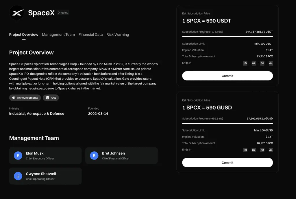 Продукт Pre-IPOs, запущенный Gate, предоставляет пользователям инструмент для отслеживания стоимости непубличных компаний. В этом выпуске в качестве объекта выступает SpaceX, а соответствующий актив — SPCX.