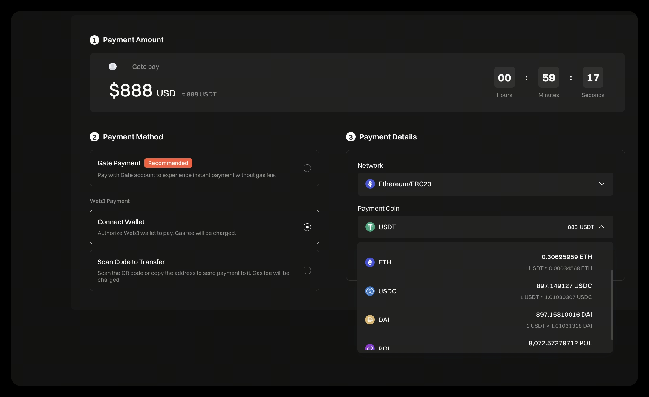 Users can freely choose the payment coin during settlement, and the system will automatically display the payable amount based on the real-time exchange rate; after payment is completed, Gate Pay will automatically convert the received amount into the order-designated settlement coin and credit it. Merchants do not need to calculate exchange rates themselves or handle cross-coin reconciliation, greatly reducing operational complexity.