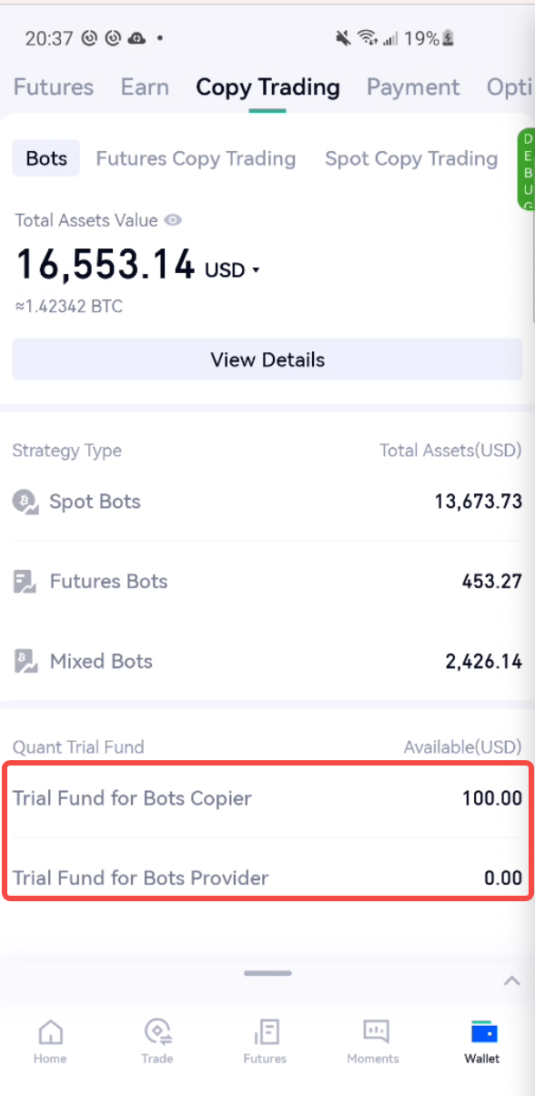 C:3)Kullanıcılar Bot Deneme Fonlarını “Varlıklar”-“ Copy Trading” bölümünde görüntüleyebilirler;