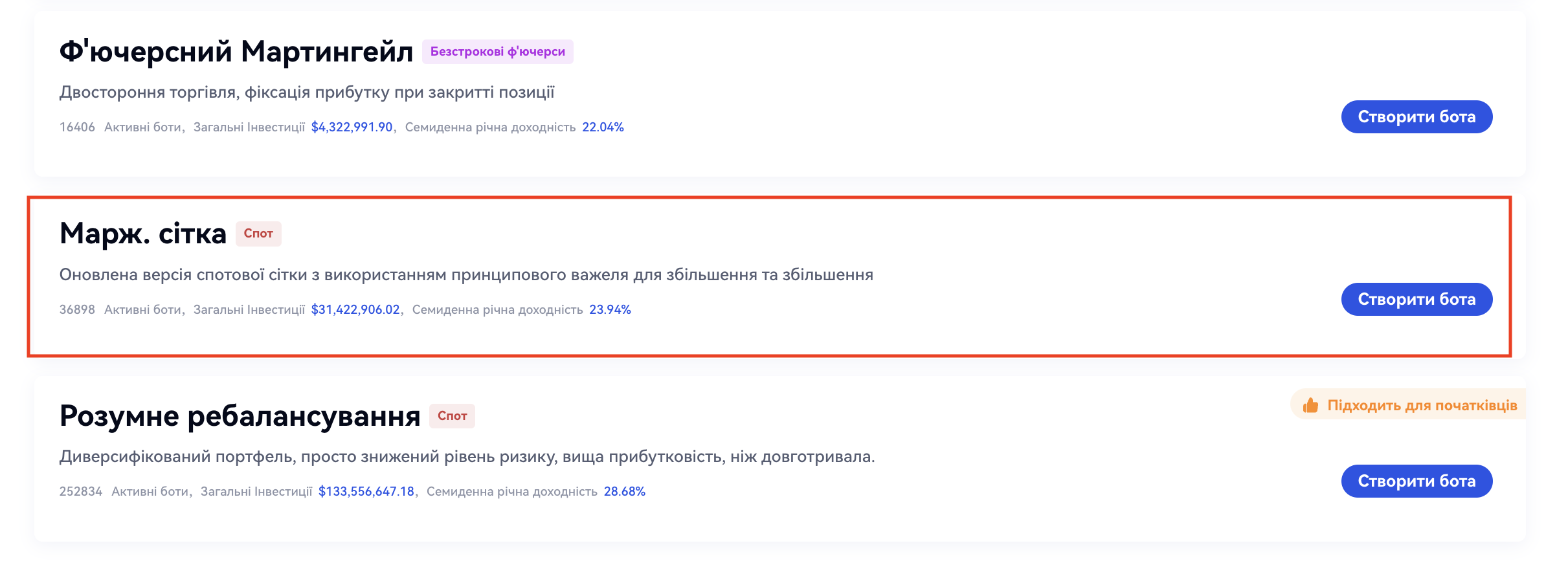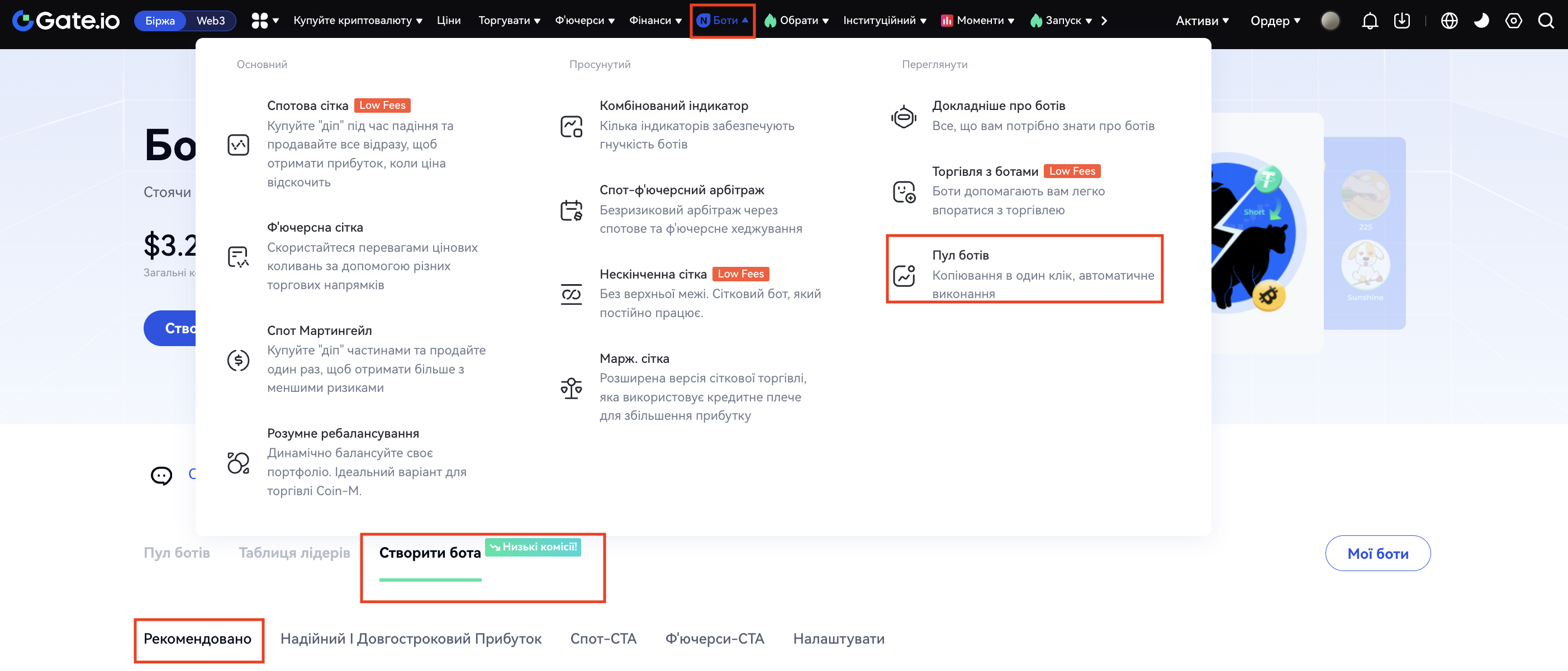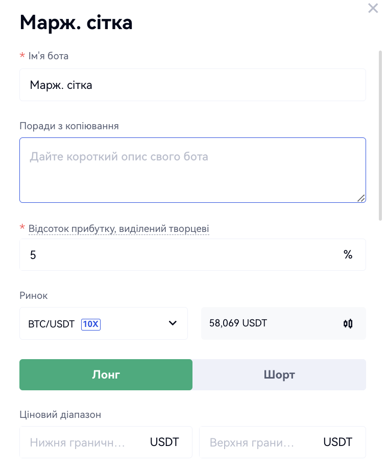 Панель навігації - "Копітрейдинг"- "Бот стратегій"- "Створити стратегію"- "Рекомендувати"- "Маржинальна сітка"- "Створити стратегію". Далі виберіть торгову пару, налаштуйте параметри і натисніть на кнопку "Створити". Як показано на малюнку нижче