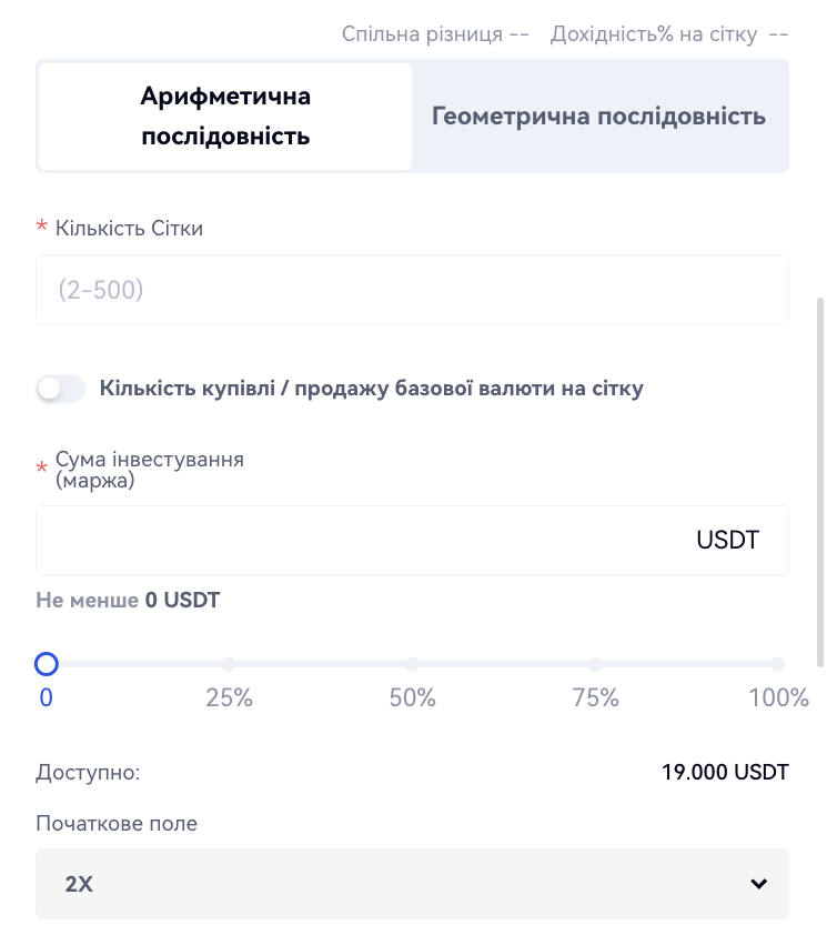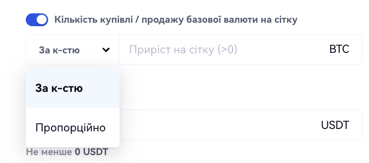 Приріст на кожну сітку:Приріст на кожну сітку: За замовчуванням вимкнено. Якщо увімкнено, кількість купівлі/продажу в кожній сітці збільшується на кількість або пропорційно від попередньої сітки.