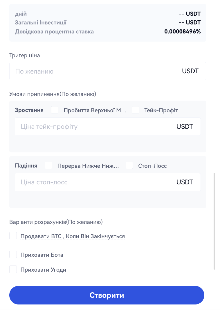 Продавати (базову валюту) при завершенні: Якщо увімкнено, ваші активи будуть використані для купівлі USDT за ринковою ціною при завершенні стратегії.
