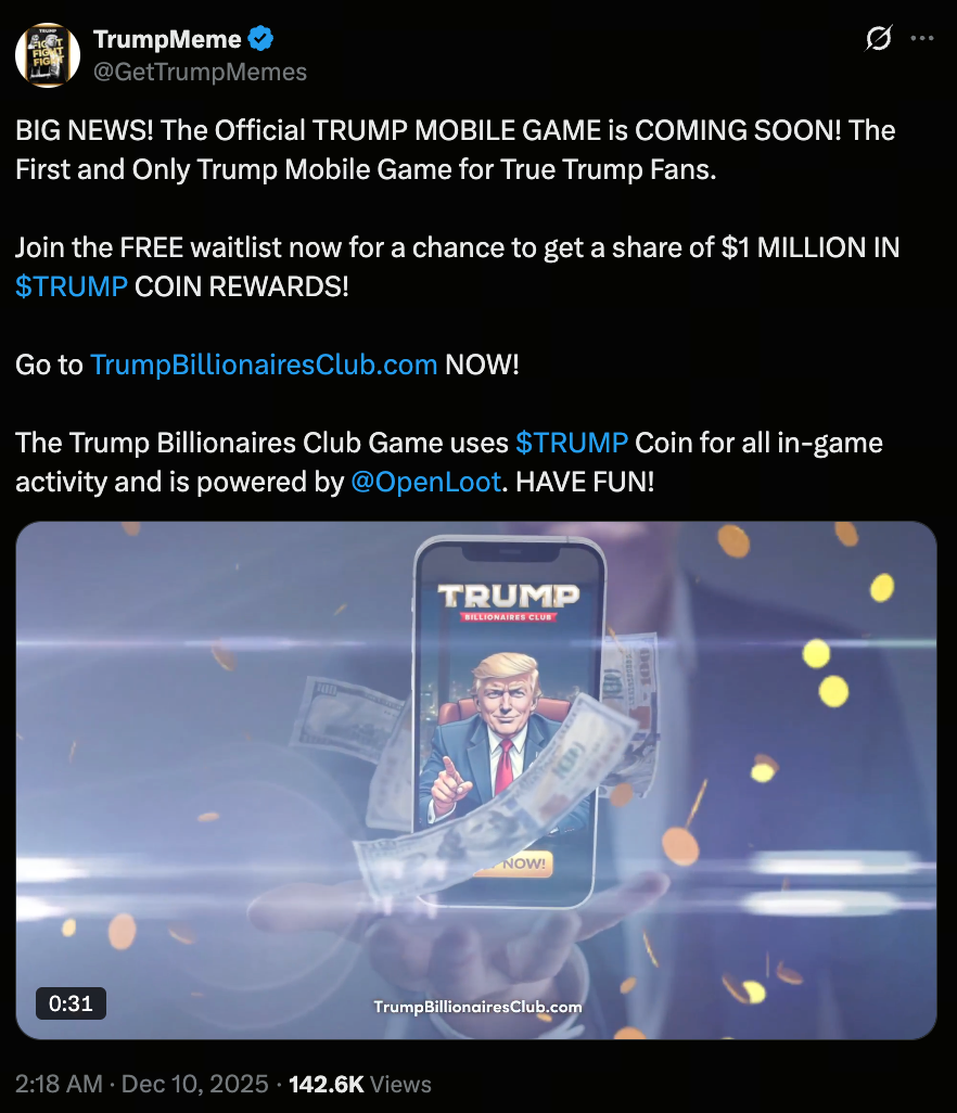 Ngày 10 tháng 12, đội ngũ chính thức của token meme TRUMP đã thông báo về sáng kiến mới nhất: một trò chơi di động dành cho cộng đồng ủng hộ sẽ sớm ra mắt. Người chơi có thể đăng ký vào danh sách chờ miễn phí và có cơ hội chia sẻ giải thưởng trị giá 1 triệu USD bằng token TRUMP. Động thái này nhanh chóng thu hút sự chú ý của thị trường và càng củng cố mối liên kết chặt chẽ giữa token này với thương hiệu của nhân vật chính trị này.
