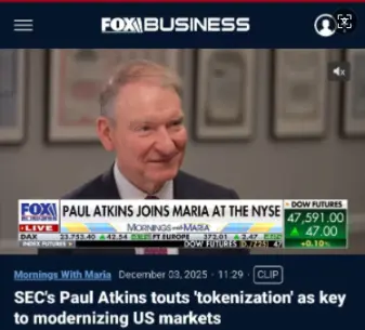 12 月 8 日消息,据福布斯报道,美国证券交易委员会 (SEC) 主席 Paul Atkins 在接受福克斯新闻直播采访时表示,预计整个美国金融市场将在未来两年内转向支撑比特币和加密货币的区块链技术。Atkins 表示,「世界将会如此,可能不需要 10 年,也许短至两年内就会实现。下一步将随着数字资产、市场数字化和代币化而到来,这将为透明度和风险管理带来巨大利益。」