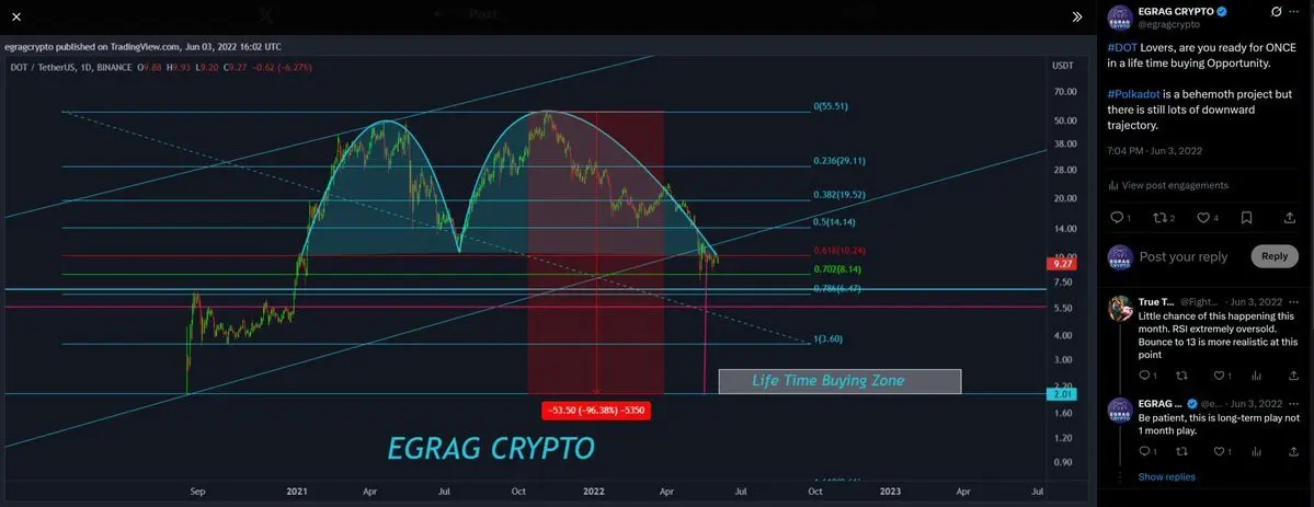 在他最新的帖子中,Egrag重申,他在DOT交易於$3 和$4之間時開始進行累積,最近在$2時增加持倉。他認為這個區間是一個結構性底部,受到歷史行為和Polkadot在更廣泛多鏈基礎設施中的角色的支撐。