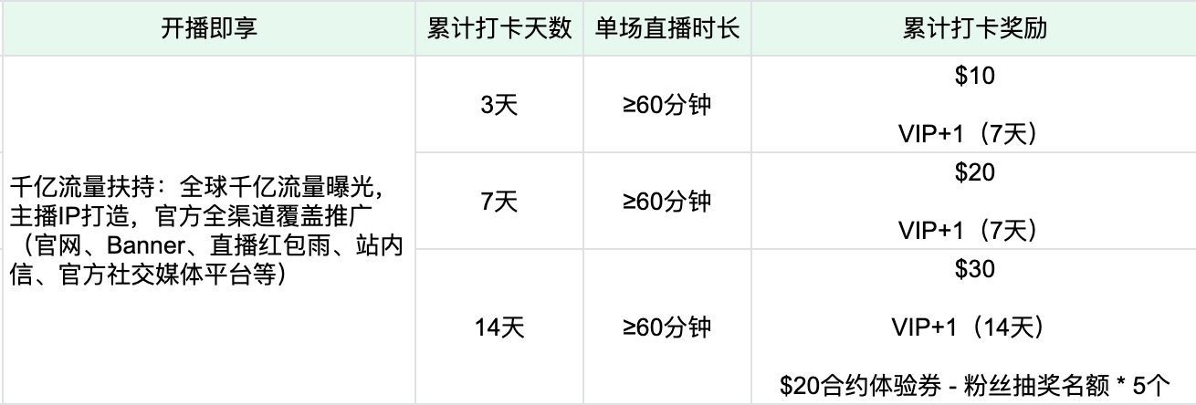 新主播持续开播,坚持开播天数越多,可获得奖励越多(奖励可叠加)。开播打卡任务如下: