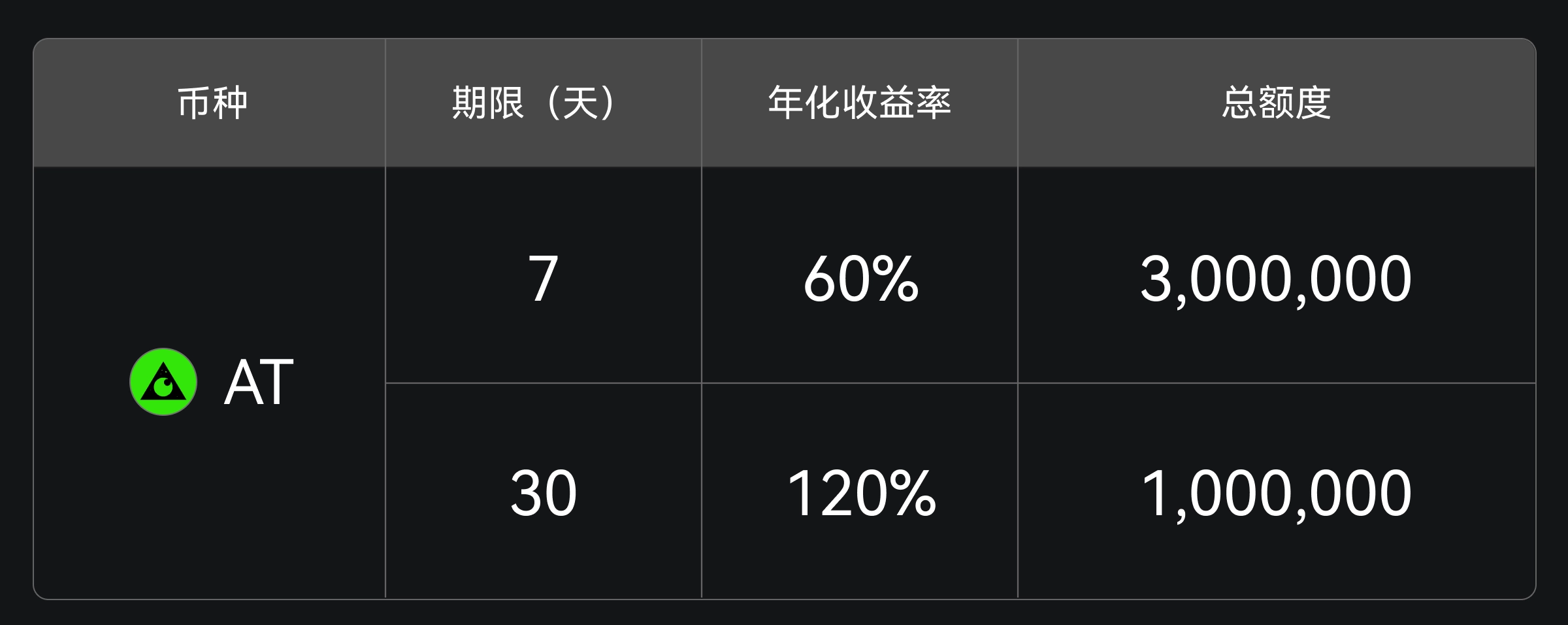 Gate 余币宝现已上线 AT 定期理财,提供 7 天和 30 天两种锁仓周期,年化收益率最高达 120%,最低仅需 5 AT 起投,欢迎前往参与申购。