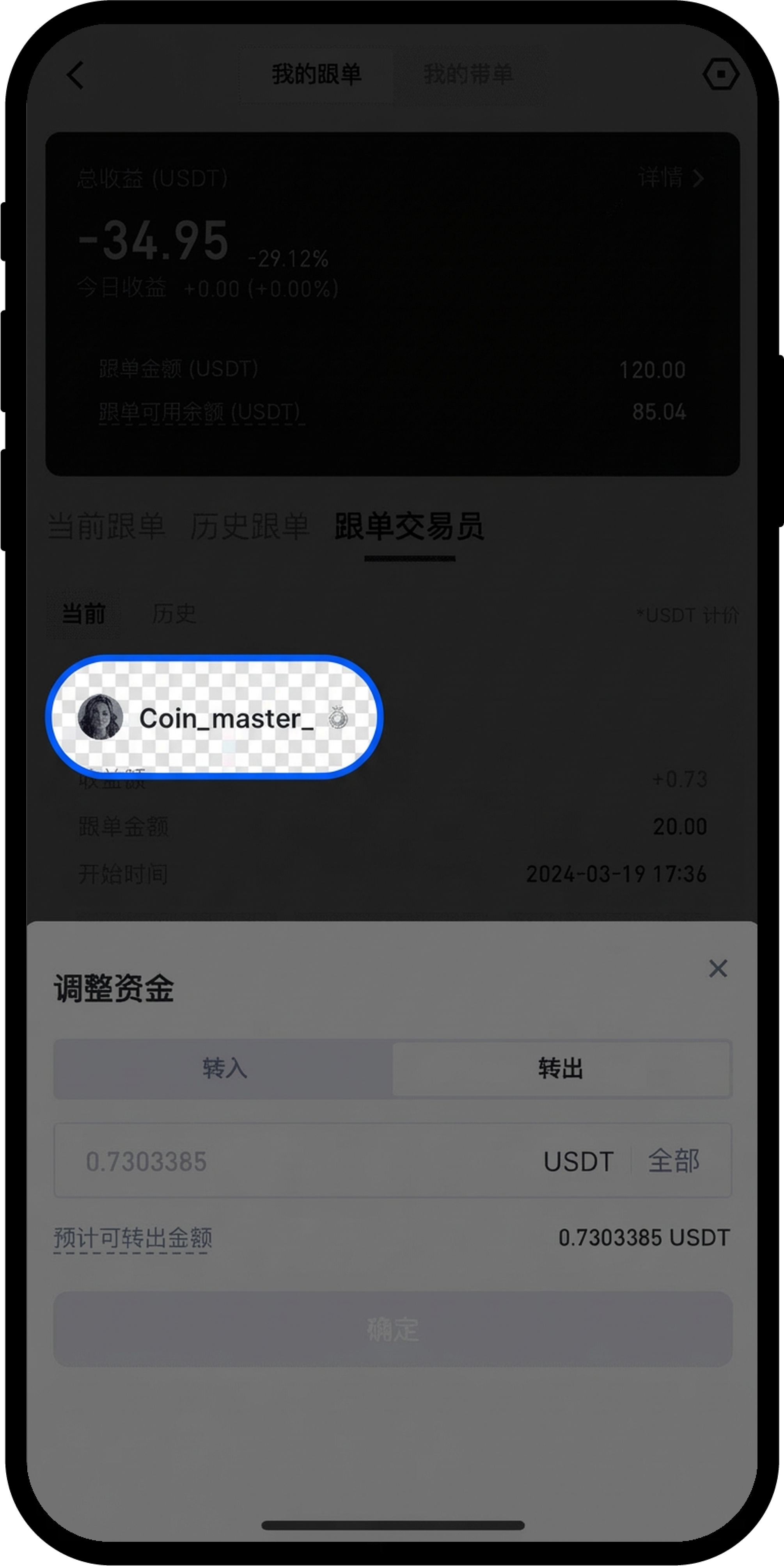 - 系统会显示当前可转出的最大金额(不能超过跟单总收益)