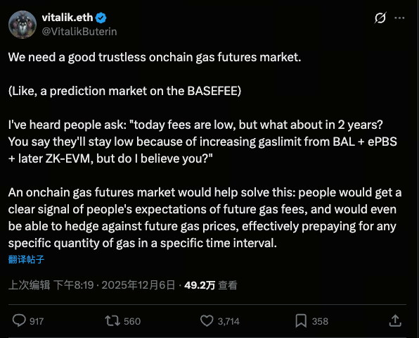 以太坊联合创始人 Vitalik Buterin 最近提出了创建一种基于区块链的 gas 期货市场 的构想。这种机制旨在让交易者能更好地对冲未来 gas 费风险,同时提升交易成本透明度。简单来说,这将让用户能提前锁定未来网络手续费价格,避免手续费波动带来的不确定性。