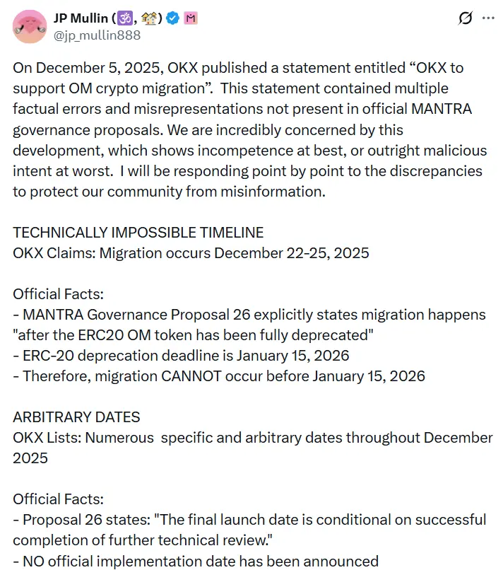 Mullin还表示,OKX的帖子提及了“2025年12月的任意日期”,而Mantra尚未宣布正式的实施日期。