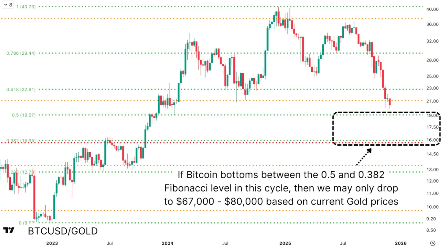 以黄金等资产衡量,比特币自 2024 年 12 月以来购买力持续下降,熊市时间远超单纯美元计价的分析所示。跨周期斐波那契回撤水平换算为美元后,指向 67,000-80,000 美元区间存在强支撑。虽然分析具有理论性,实际走势未必完全吻合,但多时间维度与估值框架的数据重合提示:熊市结束可能比市场预期更早到来。